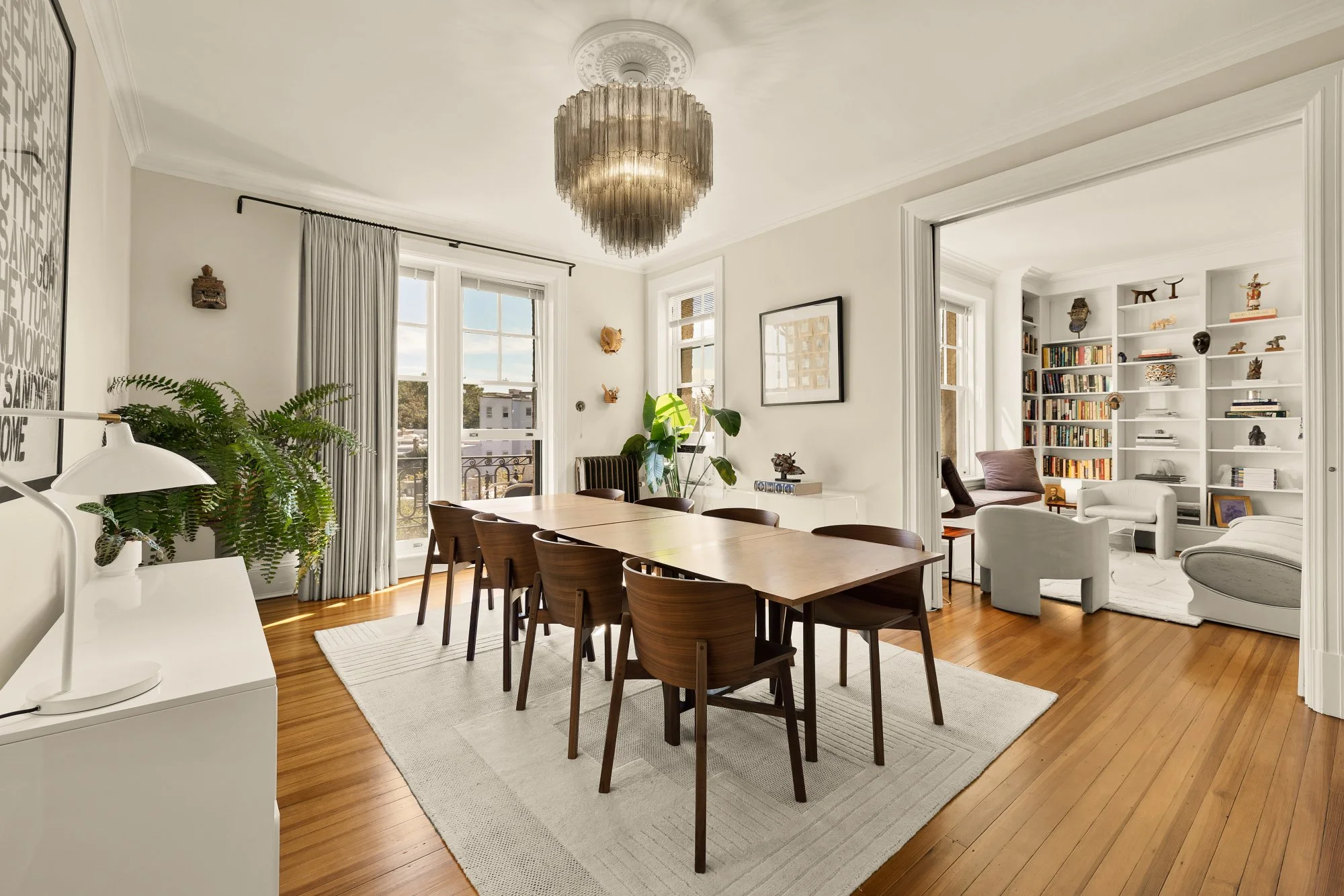 An inviting entry foyer introduces the home’s spacious layout and leads to a sun-filled living room with a decorative fireplace and a wrought-iron balcony overlooking the city. Through original pocket doors, the adjoining dining room provides a gracious setting for gatherings, featuring built-in cabinetry, a charming window seat, and access to a well-appointed butler’s pantry and windowed kitchen—ideal for both casual and formal entertaining.